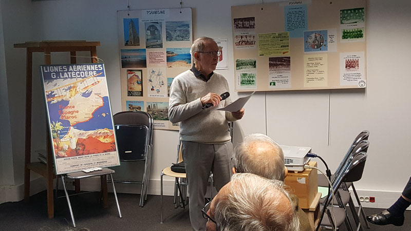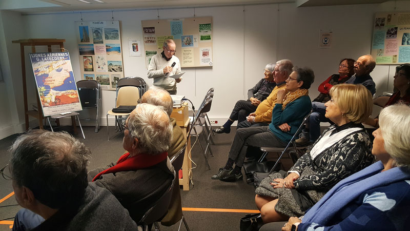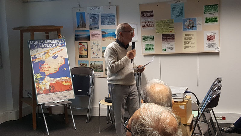 Notre ami Pierre Jarrige, spécialiste reconnu de l'aviation en Algérie nous a présenté le 18 novembre "Latecoère en Méditerranée "passionnante évocation de cette véritable épopée que fut l'histoire de cette entreprise dont les lignes aériennes ont sillonné un immense espace de la Méditerranée au Sahara. Pour sa part André Dumas a retracé la vie et la carrière de Marcel Cerdan, éphéméride du jour.