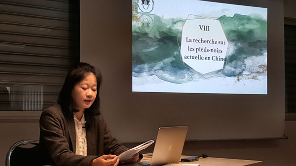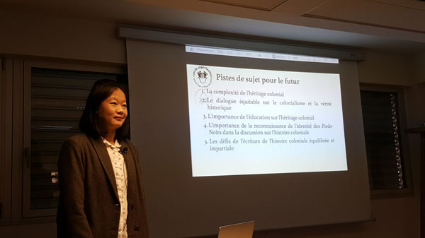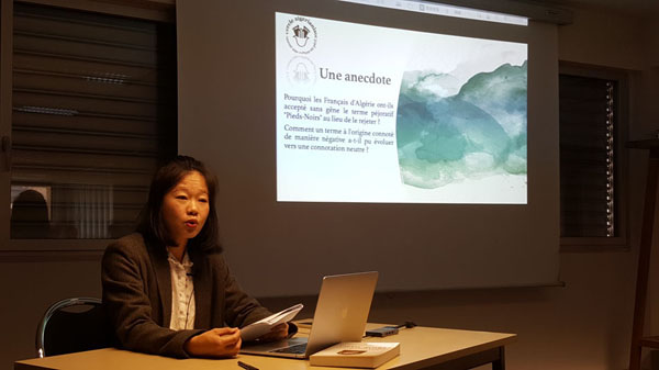 Piedes noirs français à part entière ou entièrement à part Le samedi 13 mai nous avons eu le plaisir de recevoir Emma Jie Jia professeur de français à l'université de Xian en Chine et actuellement enseignante de chinois à l'institut Confucius de Pau . Elle nous a présenté son livre, qui est aussi sa thèse universitaire, "Pieds-noirs français à part entière ou entièrement à part" , une conférence qui a beaucoup touché le public présent qui lui a su gré de l'intérêt qu'elle porte à notre communauté . Qu'elle soit vivement remerciée pour son talent et sa gentillesse . En préambule Ghislaine Delmond avait évoqué lors de l'éphéméride la personnalité d'Henri Borgeaud