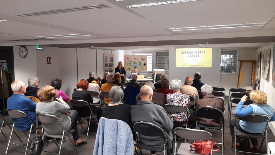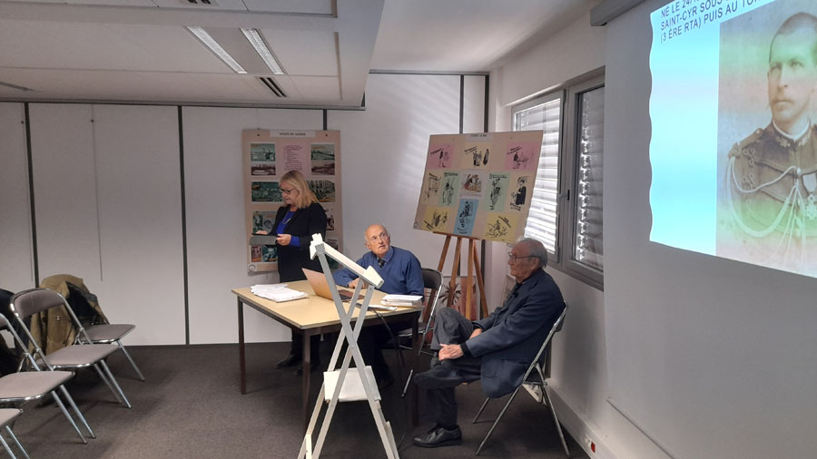 Langue et identité : le cas des Français d'Algérie C'est le titre qu'a donné Christian Lapeyre à sa causerie qui nous a plongés dans nos racines historiques et linguistiques : des explications techniques sur l'évolution des langages des différentes identités méditerranéennes qui se sont retrouvées sur notre terre. Christian nous a présenté les auteurs qui ont immortalisé ce vocabulaire riche de plusieurs origines : André Lanly pour son « Français d'Afrique du Nord » , Louis Bertrand pour son inoubliable « Sang des races », Albert Camus avec « Noces», Paul Achard pour « L'homme de mer », Auguste Robinet (dit Musette ) avec son » Cagayous ». Et pour nous régaler un peu plus, Christian nous a gratifié de quelques lectures avec un accent digne de l'école Bab el Oued. Lors de l'éphéméride, Ghislaine Delmont nous a présenté le Général Albert d'Amade . Ce toulousain sorti de St Cyr en 1876, sert en Algérie, au Tonkin. Et c'est au Maroc en temps que Général qu'il créé les premiers goums marocains qui serviront sous encadrement essentiellement français jusqu'en 1956. “Création des goums marocains par le Général Amade (1/11/1908)”