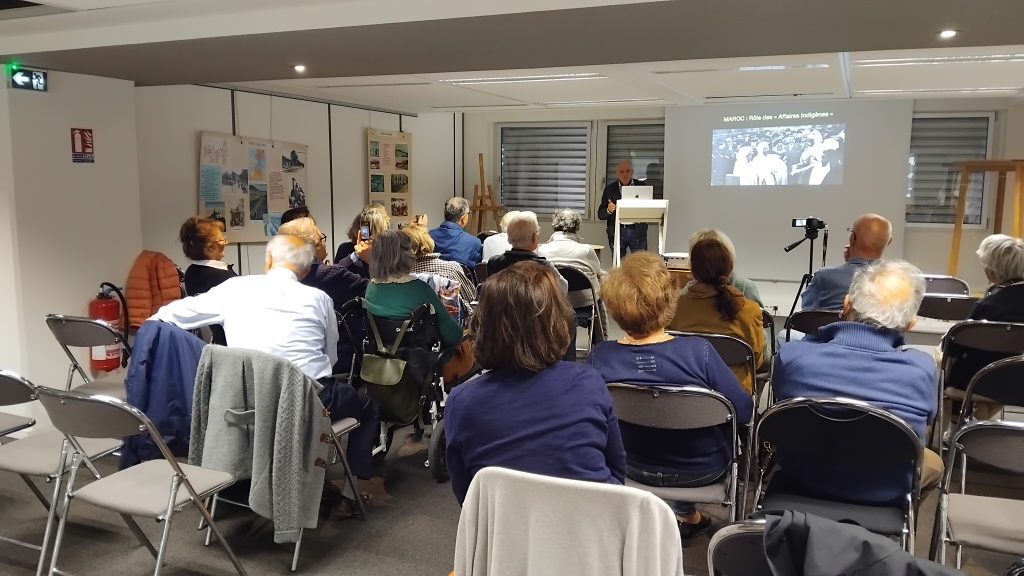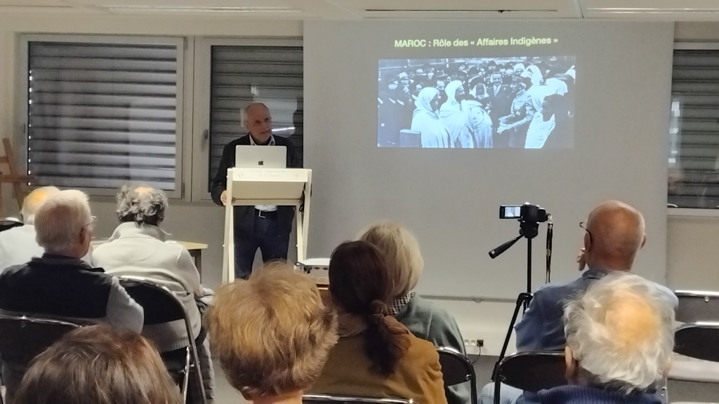 Denis Apvrille, notre conférencier de ce 11avril, natif d'Hussein Dey est issu d'une famille dont les membres se retrouvent au Maroc, en Algérie et en Tunisie. C'est en s'appuyant sur la carrière de son grand-père qu'il nous présente "Le rôle du service des affaires indigènes au Maroc ", application au territoire chérifien du traité de Protectorat de 1912, exposé historique particulièrement instructif. Comment ne pas faire dès lors un rapprochement avec les bureaux arabes et les SAS en Algérie qui dans des circonstances et des visées différentes ont accompli une œuvre assez voisine? En ouverture, Jean Salvano, administrateur du cercle, nous a parlé de l'inauguration de la passerelle de Constantine en 1925: éphéméride largement illustrée de photos du site de l'antique Cirta. Christian Lapeyre La conférence (la vidéo prochainement sur notre chaine Youtube)